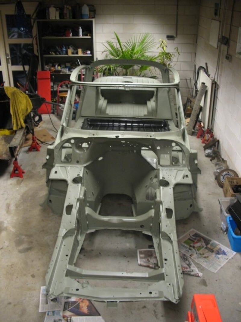 Het chassis is weer terug op de thuisbasis. Inspecteer het zorgvuldig op eventuele plekken die mogelijk niet volledig bedekt zijn met epoxy-primer. Bij een professioneel spuitbedrijf zal dit in de praktijk vrijwel niet voorkomen.