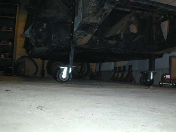 De dame is van haar steunen gehaald en voorzien van vier tijdelijke zwenkwielen. Hieronder zie je een blik op het voorste gedeelte.