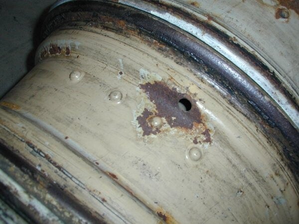 De banden zijn zorgvuldig van de velgen verwijderd, aangezien de velgen flink waren aangetast door roest.