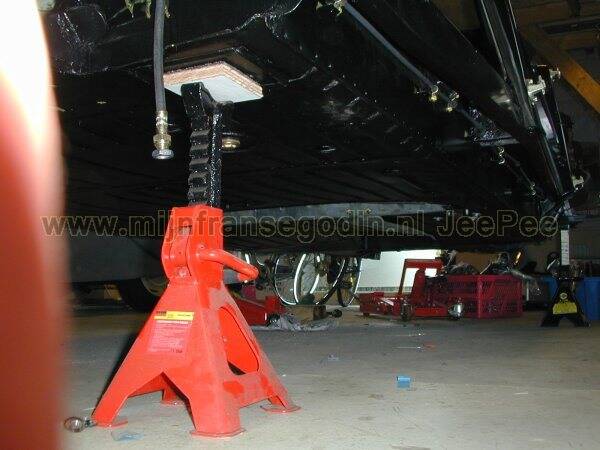Om de montage te kunnen uitvoeren, zijn de tijdelijke steunen verwijderd en staat het chassis nu weer stevig op assteunen.