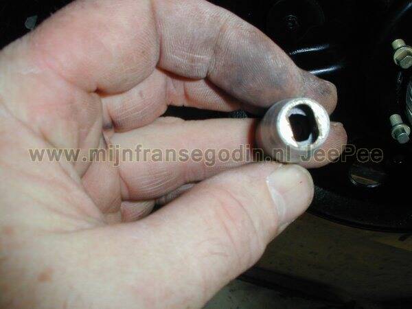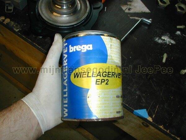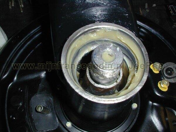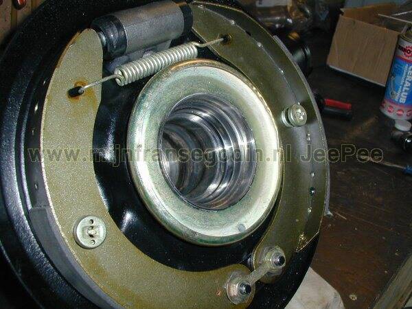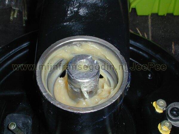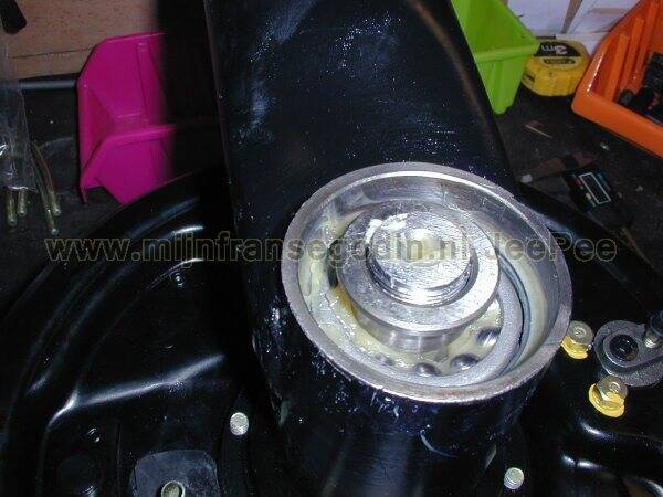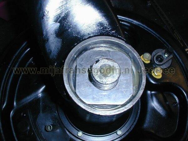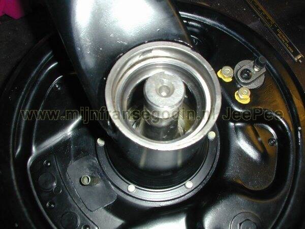 Het onderste lager is inmiddels geplaatst, en de as steekt nu naar buiten. De oude lagers zijn hergebruikt, aangezien deze nog in uitstekende staat verkeren.