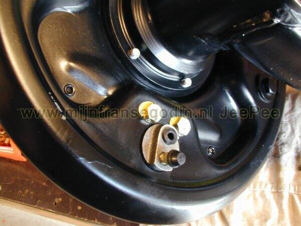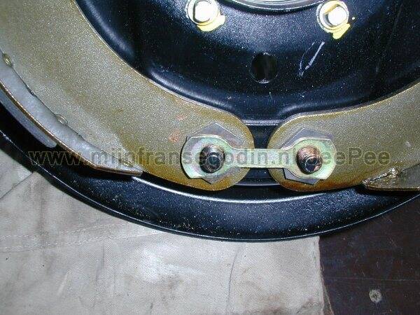 De stelmoer van de oude remschoen wordt overgezet op de nieuwe versie.