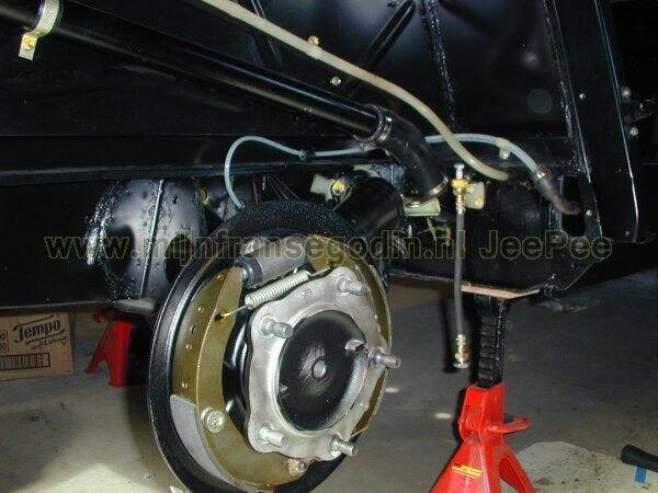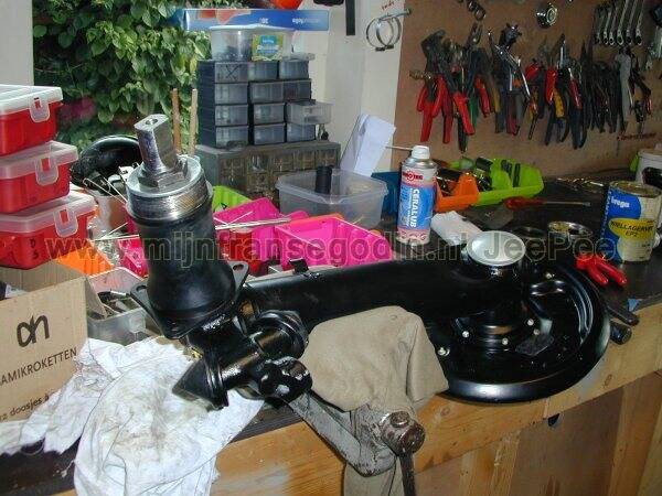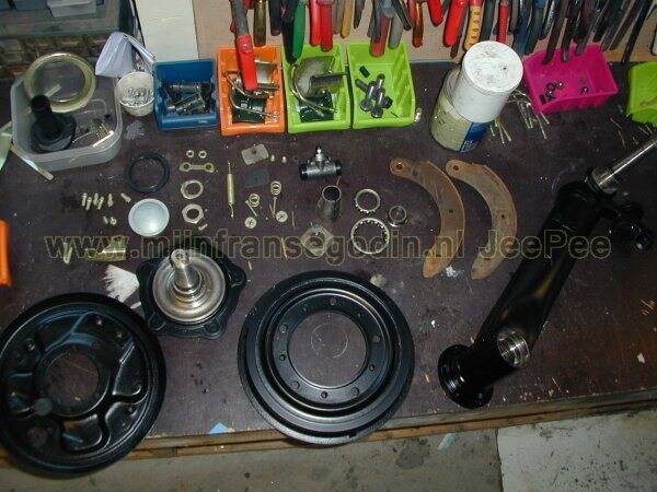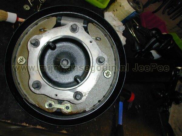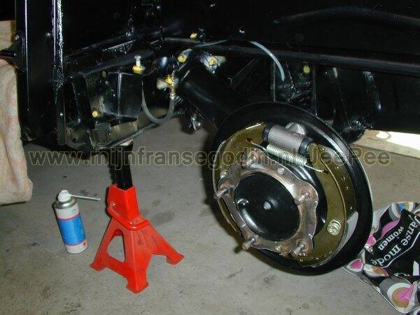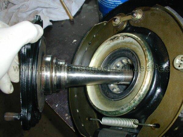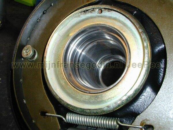 Nagenoeg afgemonteerde remtrommel aan de linkerzijde.