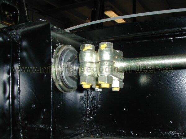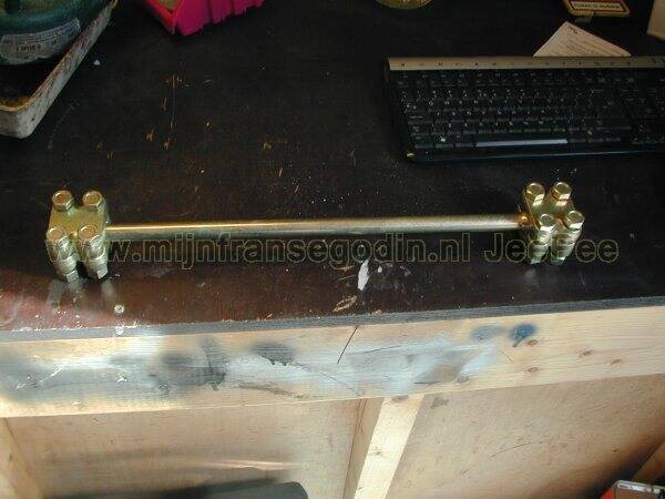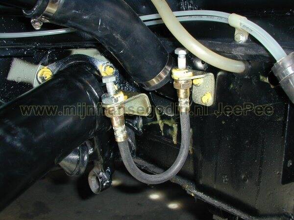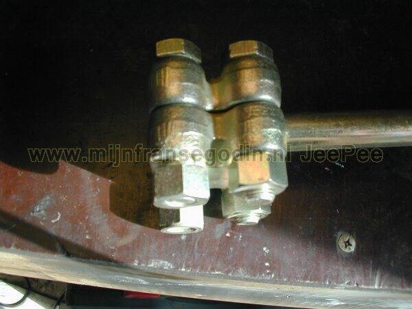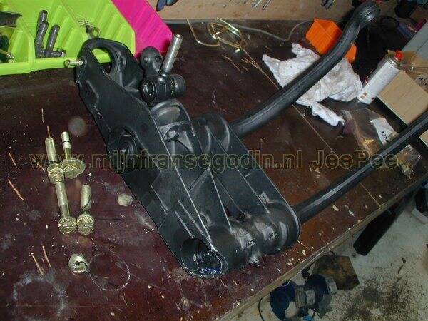 De flexibele remslang zit ook weer afgemonteerd op de draagarm. De tijdelijke boutjes in de draadeinden zijn zuiver ter bescherming ( tegen vuil en stof).
