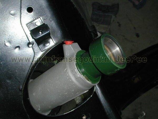 Direct het verlengstuk voor de rechter veercilinder tijdelijk gemonteerd. Let op: de cilinder moet nog 180 graden worden gedraaid.